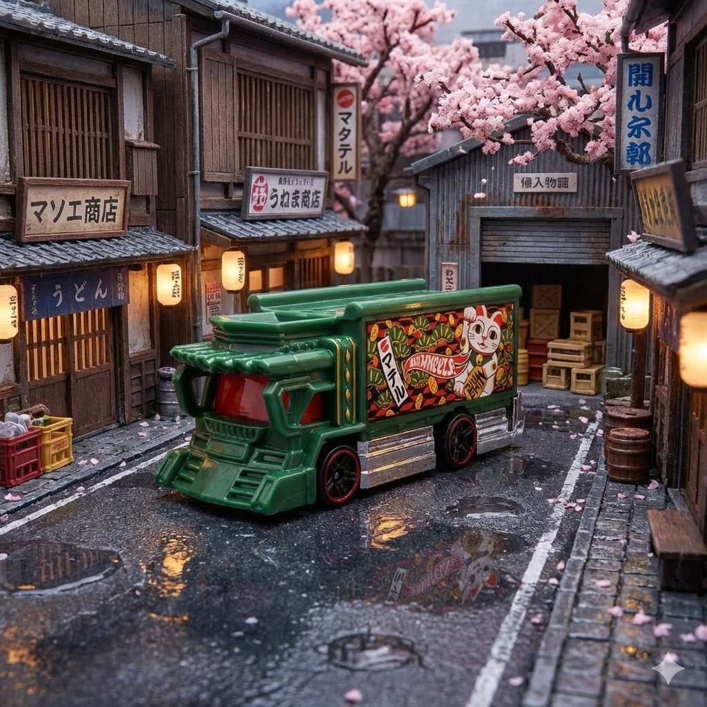 A miniatura Raijin Express é um modelo de caminhão utilitário com um design que evoca um estilo japonês, frequentemente descrito como tendo "presença de sobra" entre outros veículos da linha. É um item colecionável, conhecido por seus detalhes e resistência, que agrada tanto crianças quanto colecionadores adultos. O código JJJ27-N7C5 é uma referência específica para a versão verde deste modelo.